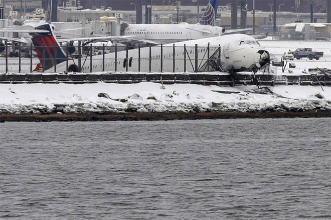 Lúc hạ cánh tại sân bay LaGuardia ở New York, chuyến bay 1086 của hãng hàng không Mỹ Delta Air Lines đã trượt khỏi đường băng và đâm qua hàng rào trước khi dừng lại ngay bên bờ vịnh Flushing - Tin và ảnh: Reuters.