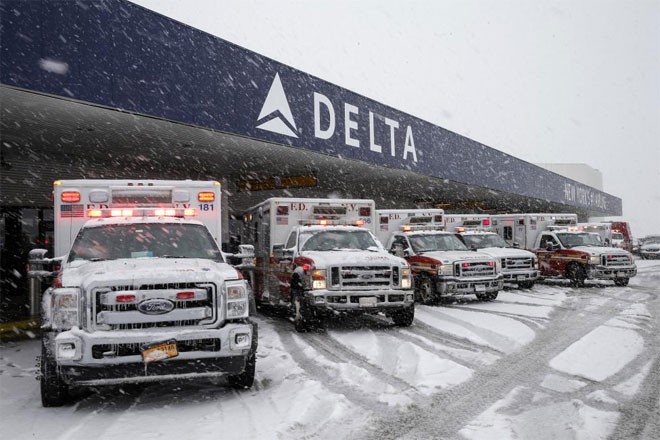 Xe cấp cứu có mặt tại sân bay LaGuardia sau sự cố. Theo đánh giá ban đầu, thời tiết bão tuyết lớn được cho là nguyên nhân khiến chuyến bay đến từ Atlanta trượt khỏi đường băng - Tin và ảnh: Reuters.