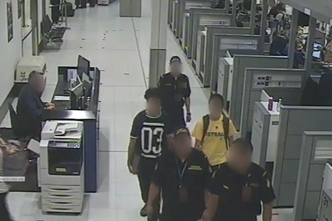 Hai đối tượng bị cảnh sát dẫn giải ở sân bay Sydney. Ảnh chụp từ camera an ninh sân bay. (Nguồn: abc.net.au)
