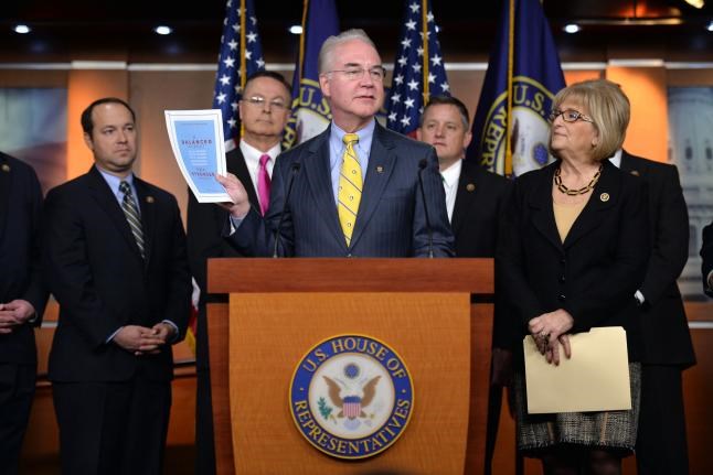 Chủ tịch Ủy ban Ngân sách Hạ viện Mỹ Tom Price với bản dự thảo có tên "Ngân sách cân bằng vì một nước Mỹ vững mạnh hơn". (Ảnh: UPI)