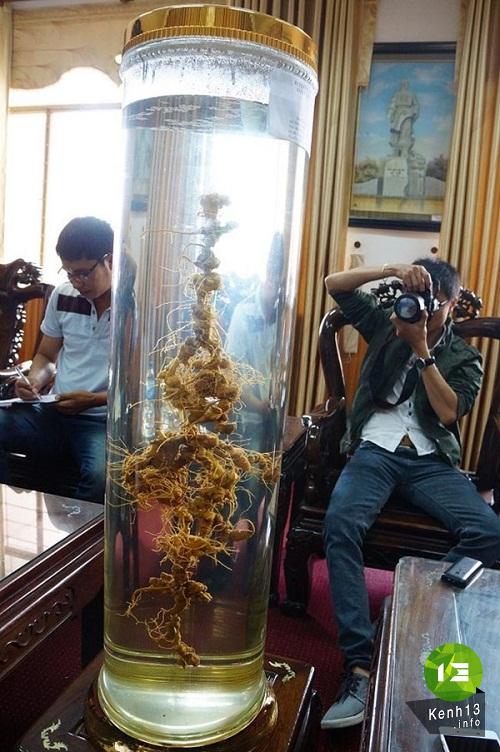 Thông tin trên báo Dân việt, bình sâm cao khoảng 1m, dạng bình tròn, phía bên trong có đến vài chục củ sâm Ngọc Linh quý hiếm nối gắn dính với nhau tạo thành một củ “sâm khủng” rất đẹp mắt.