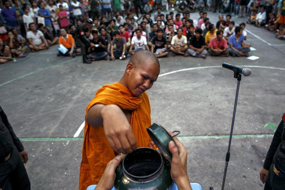 Một nhà sư bốc thăm trong một chiếc lọ nhựa tại buổi sơ tuyển tân binh ở Klong Toey. (Ảnh: Reuters).