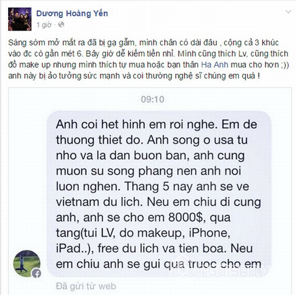 Mới đây nhất, nữ ca sĩ Dương Hoàng Yến gây xôn xao dư luận khi chia sẻ tin nhắn có nội dung gạ gẫm cô nàng “đi du lịch” với giá 8.000 USD.