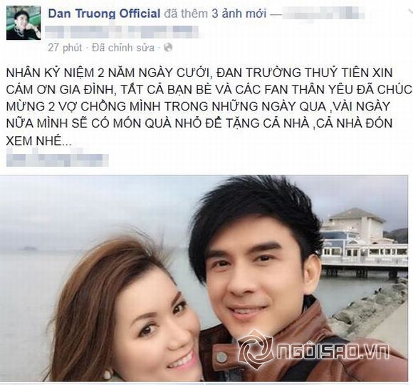 Vợ chồng Đan Trường khiến fan "nức lòng" khi chia sẻ những hình ảnh kỷ niệm hai năm ngày cưới. Anh Bo viết: "Nhân kỷ niệm hai năm ngày cưới, Đan Trường Thủy Tiên xin cảm ơn gia đình, tất cả bạn bè và các fan thân yêu đã chúc mừng hai vợ chồng mình trong những ngày qua. Vài ngày nữa, mình sẽ có món quà nhỏ để tặng cả nhà, cả nhà đón xem nhé."