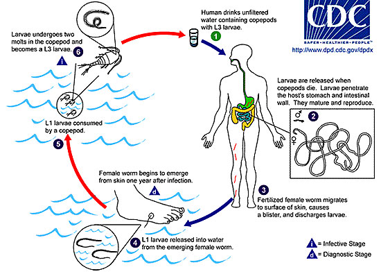 Sau khi nuốt phải, các loài giáp xác nhỏ này chết và ly giải ra các ấu trùng, các ấu trùng này đi xuyên qua dạ dày và thành ruột và đi vào trong khoang bụng và đi ngược vào khoang phúc mạc.Khoảng chứng một năm sau khi nhiễm, con giun cái gây ra các nốt phỏng trên da, chứa dịch. Các nốt này có thể vỡ ra bất cứ lúc nào.Bệnh nhân thường có xu hướng tiếp xúc với nước để giảm đau và đây chính là cơ hội để giun cái trồi ra ngoài da, ly giải rất nhiều ấu trùng vào trong nước.