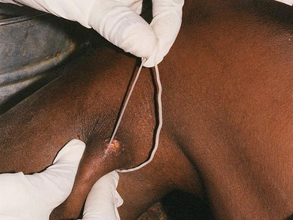 Căn bệnh Guinea worm nhìn bề ngoài cũng rất đáng sợ. Ở những người nhiễm bệnh này, ta thường sởn gai ốc vì bắt gặp cảnh người bệnh dùng tay kéo con giun từ những vết thương mở ra ngoài, có những con giun dài tới trên 1 mét.