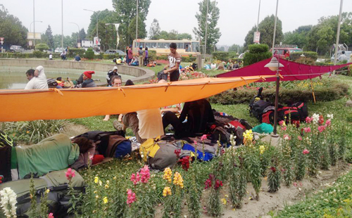 Người nằm la liệt ở khu vực xung quanh sân bay để chờ rời khỏi Nepal. Ảnh: K.C.