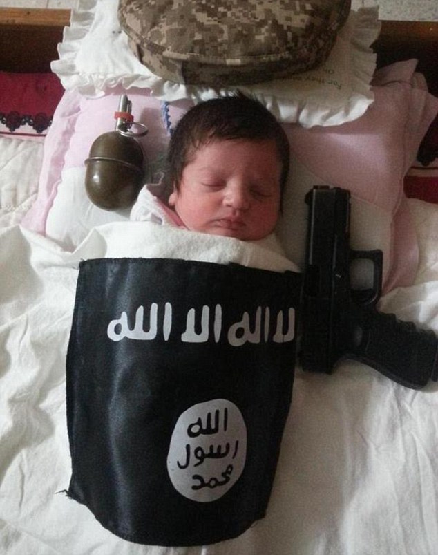 Khuôn mặt ngây thơ đang ngủ của trẻ sơ sinh được đặt cạnh một khẩu súng ngắn và quả lựu đạn và được đắp một chiếc chăn có in biểu tượng của tổ chức Nhà nước Hồi giáo tự xưng (IS).