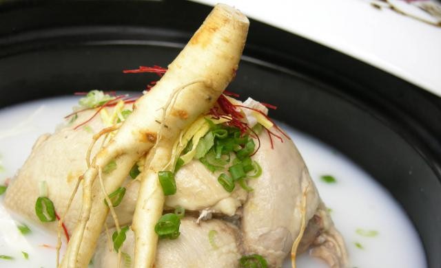 Gà làm sạch cho thêm hoàng kỳ, gừng hấp chín. Sau đó thêm gia vị, hành, muối và nước vào hầm trong 3 giờ.