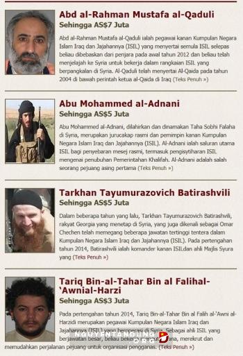Trong khi đó, tên Abu Mohammed al-Adnani, một phiến quân khoảng 38 tuổi của Syria, có tên khai sinh là Taha Sobhi Falaha, cũng bị truy nã với số tiền thưởng là 5 triệu USD cho người cung cấp thông tin giúp bắt hoặc tiêu diệt hắn.