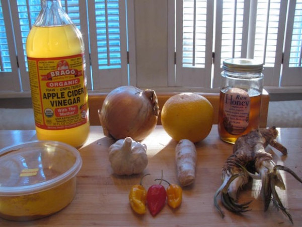 Đặt rễ gừng, cải ngựa, tỏi, hành tây và vỏ chanh và nước trái cây trong một lọ thủy tinh.