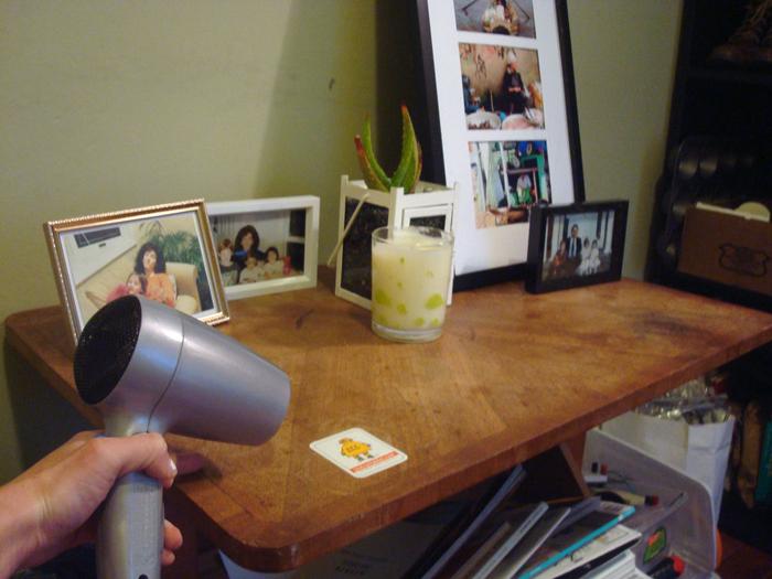Chỉ cần dùng máy sấy tóc sấy miếng nhãn, khí nóng sẽ làm lớp keo bong ra và bạn dễ dàng tháo nhãn ra mà không để lại dấu vết.