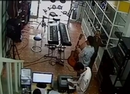 Camera ghi lại h́nh ảnh cụ bà lấy trộm điện thoại trong cửa hàng bán dụng cụ âm nhạc.