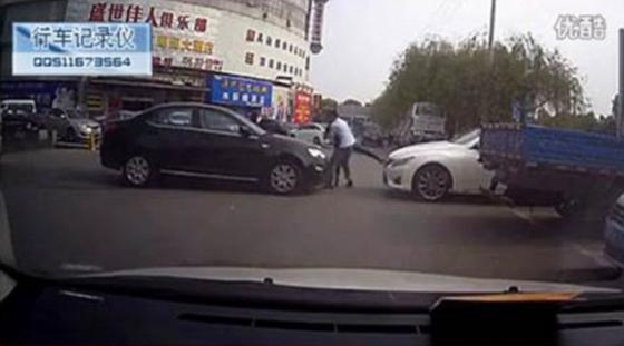Dặn chồng phải đón con, nhưng anh này lại mải đàn đúm với bạn bè quên béng mất. Chị vợ tức giận lái xe đâm thẳng vào xe ô tô của chồng, cảnh tượng diễn ra như trong phim hành động, chưa hết, người vợ còn xông vào đấm đá chồng tơi tả. Thế mới thấy "hung khí" đàn bà Tàu.