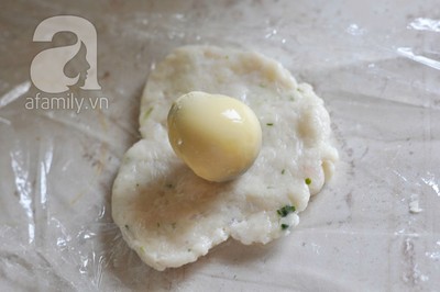 Trải một tấm màng bọc thực phẩm ra, múc một viên chả cá lên, tán mỏng. Đặt lòng đỏ trứng vào giữa.