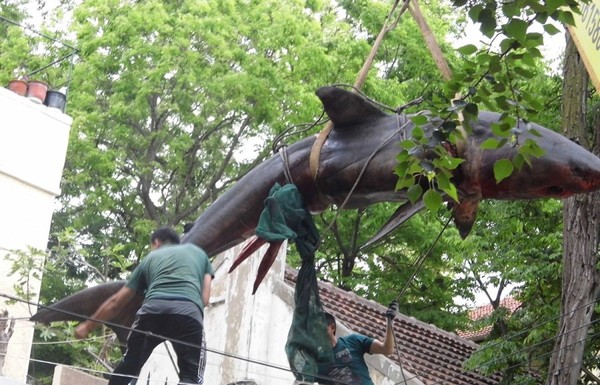 Những người đàn ông đang cố gắng đưa con cá mập vào trong nhà bằng chiếc máy cẩu.