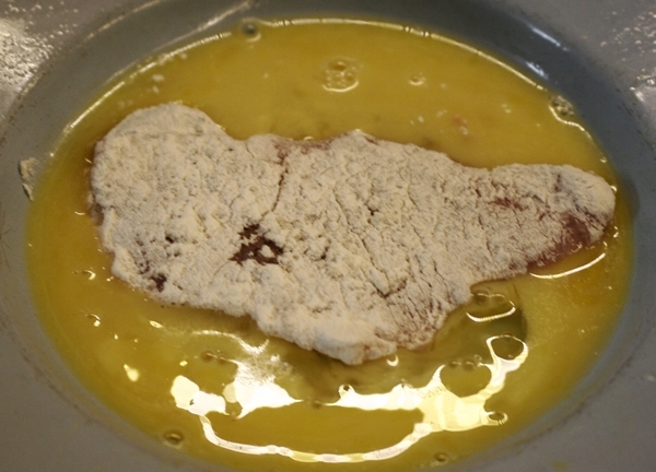 Trứng đập ra đĩa và khuấy đều. Lần lượt tẩm thịt qua bột mì, trứng rồi đến bột chiên xù.