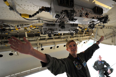 Phi công của máy bay tuần thám P-8 Poseidon giới thiệu khoang vũ khí của nó với ký giả tại căn cứ ở Singapore, nơi xuất phát các chuyến tuần tra Biển Đông của Hải quân Hoa Kỳ. (Hình: MOHD FYROL/AFP/Getty Images)