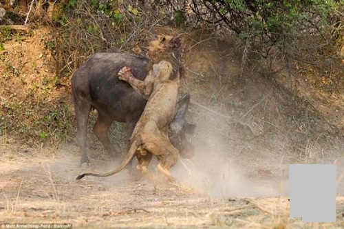 Những hình ảnh này được ghi lại tại vườn quốc gia Luangwa, Zambia. Sau trận chiến kéo dài nhiều giờ, cả trâu rừng và sư tử đều bị thương. Sư tử đã chết 2 ngày sau đó, còn 2 tuần sau con trâu rừng cũng bỏ mạng vì không thể hồi phục sau cuộc chiến sống còn.
