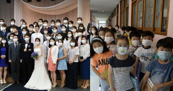 Dịch bệnh MERS cũng ảnh hưởng tới ngày trọng đại của một cặp đôi. Cô dâu chú rể và khách mời trong đám cưới đã phải đeo khẩu trang phòng ngừa virus MERS tại một lễ cưới tại thành phố Pyeongtaek, tỉnh Gyeonggi, Hàn Quốc.