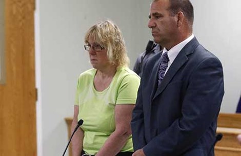 Ngày 12-6 (giờ địa phương), bị cáo Joyce Mitchell trong tư thế bị còng tay cùng luật sư ra trước tòa án ở Plattsburgh (ảnh).