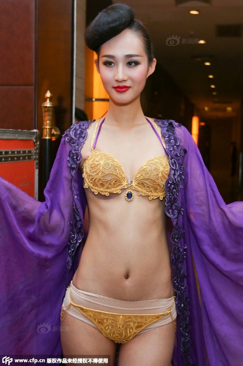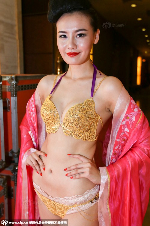 Hai bộ đồ lót làm bằng vàng có giá gần 14 tỷ USD mới đây đã được ra mắt trong một show diễn thời trang ở Trung Quốc. Được biết, bộ đồ lót này được thiết kế trong 1 năm và mất 6 tháng để hoàn thiện chi tiết đến từng đường kim, mũi chỉ!