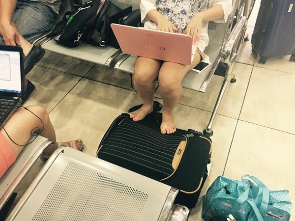 Tại sân bay Nội Bài, mặc dù đã được một hành khách khác ngỏ ý ngồi cùng nhưng người phụ nữ này vẫn nhất định không chịu nhường ghế và tỏ ra khó chịu. Không những thế, người này và con gái thậm chí còn mỗi người một laptop ung dung gác chân lên vali tạo ra những hình ảnh thiếu lịch sự ở sân bay.