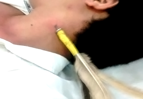 Cây phi tiêu ghim vào cổ anh Trung. Ảnh: Mai Linh.