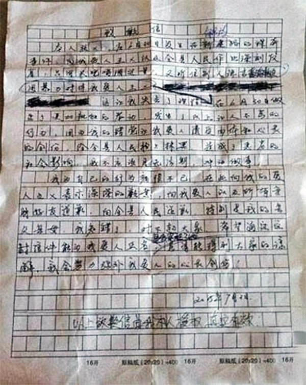 Lá thư viết tay xin lỗi vợ của Zhang trên một tờ báo địa phương.
