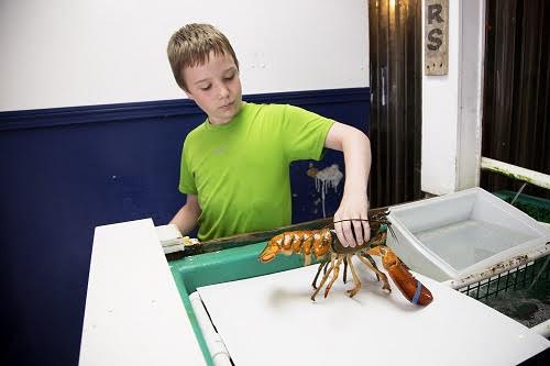 Bé trai 12 tuổi Ted Hyatt cầm con tôm hai màu cam xám tại Chợ hải sản Pine Point hôm 6/7. Ảnh: Portland Press Herald