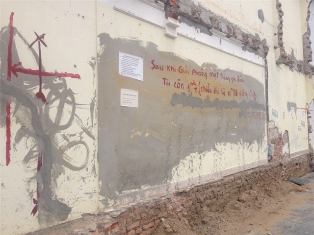 Ông Châm đã viết dòng rao bán trên bức tường còn lại này với nội dung: Sau khi GPMB, gia đình tôi còn lại 1,7m2 đất, chiều dài 10,85m, chiều rộng 0,14m” kèm theo số điện thoại để người mua liên hệ.