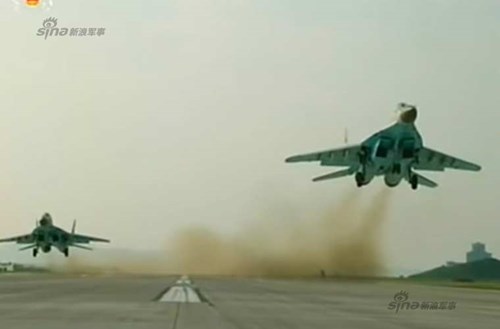 Điều đặc biệt, trong cuộc thi “Aviadarts Triều Tiên” có sự tham dự của hầu hết các chiến đấu cơ Triều Tiên vốn ít khi xuất hiện như máy bay ném bom H-5, trực thăng Mi-2, cường kích Su-25… Ảnh: Chiến đấu cơ hiện đại nhất Triều Tiên MiG-29 xuất kích.
