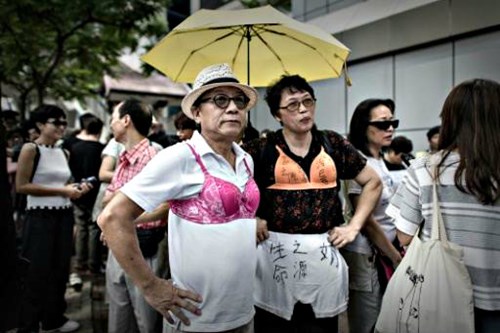 Ông James Hon - giáo viên đã nghỉ hưu (66 tuổi) mặc chiếc áo ngực màu hồng bên ngoài chiếc áo sơ mi nói với AFP: "Đã đến lúc phải mặc áo ngực cả đời. Chúng tôi dùng biện pháp lạ lùng này để tố cáo với thế giới sự lố bịch của cơ quan cảnh sát. Ngực không phải là vũ khí - hãy trả lại tự do cho bộ ngực của chúng tôi".