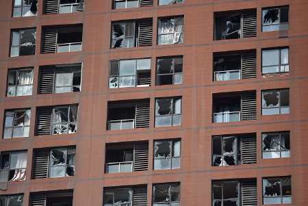 Cửa kính tòa chung cư cách xa hiện trường vẫn vỡ tung sau vụ nổ (Ảnh:AFP)