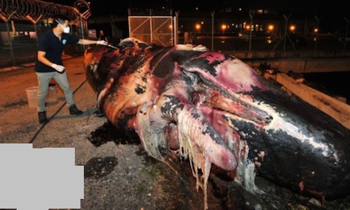 Khi được kéo vào bờ, xác của con cá voi đã trong quá trình phân huỷ, bốc mùi hôi thối ảnh hưởng khá nhiều tới môi trường xunh quanh khu vực. Để điều tra nguyên nhân dẫn đến cái chết của con cá voi này, các thành phần da và thịt trên cơ thể được đem đi xét nghiệm, thêm vào đó các chuyên gia cũng quyết định tiến hành mổ bụng chú cá voi để xác định xem trước khi chết, con cá voi đã ăn những thứ gì mà khiến phần bụng bị trướng lên vô cùng kì lạ.