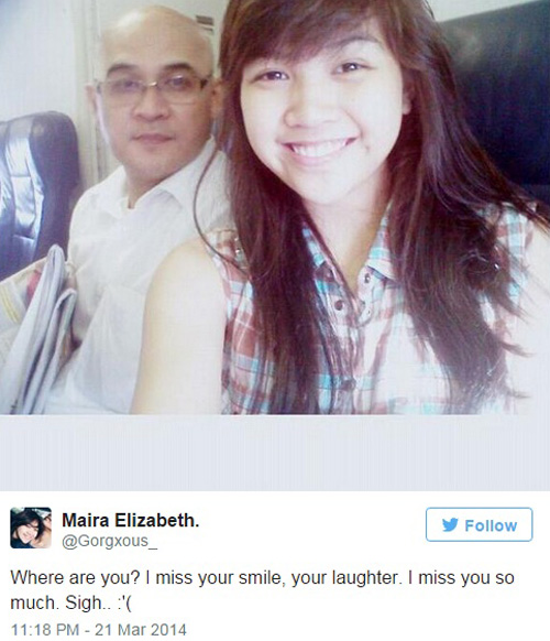 VBF-Kể từ sau vụ chiếc máy may xấu số MH 370 mất tích đầ bí ẩn thì suy nhất chỉ còn có cô con gái của tiếp viên trưởng vẫn không tin là cha cô đã chết. Thậm chí ngày nào cô cũng gửi thư cho cha với nhiều nỗi nhớ khiến ai cũng phải cảm động.Một năm rưỡi sau vụ máy bay MH370 mất tích bí ẩn, con gái của tiếp viên trưởng chuyến bay định mệnh vẫn đều đặn gởi thư cho cha, bảo rằng cô vẫn đang đợi cha về. "Bưu điện" mà cô chọn để gởi thư là Twitter và Instagram.Kể từ khi người cha tiếp viên trưởng Andrew Nari biến mất cùng với chiếc Boeing 777, cô con gái Maira Elizabeth Nari, 19 tuổi, vẫn không ngừng viết cho cha.