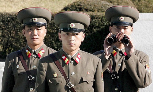 Các binh sĩ Triều Tiên tại làng đình chiến Panmunjom thuộc khu phi quân sự (DMZ) nhìn qua biên giới, hướng về phía Hàn Quốc. Ảnh: EPA