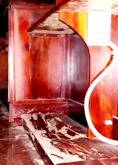 Bàn ghế trong hội trường chính bị mối mọt ăn mục nát. Ảnh: Phúc Hưng.