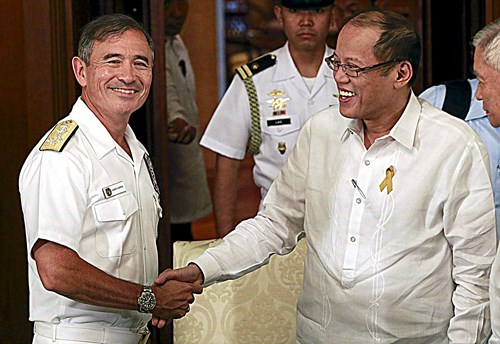 Bộ Tư lệnh Thái Bình Dương của Mỹ, Đô đốc Harry Harris (trái) được Tổng thống Philippines Benigno Aquino tiếp đón trong chuyến thăm Manila - Ảnh: Reuters