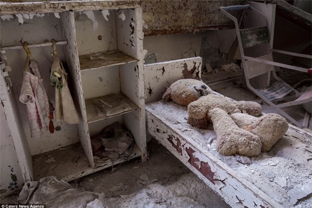 Nhiếp ảnh gia người Áo Roland Verant, 35 tuổi, đã dũng cảm tới "vùng cấm vào" của thị trấn cách vụ nổ 3 km để chụp những gì còn sót lại. Trong ảnh là con gấu bông bị lãng quên và những bộ quần áo trẻ em mục nát.