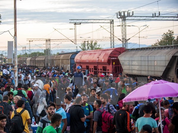 Người di cư tại nhà ga tàu hỏa ở thị trấn Gevgelija, Macedonia ngày 22/8. (Nguồn: AFP/TTXVN)