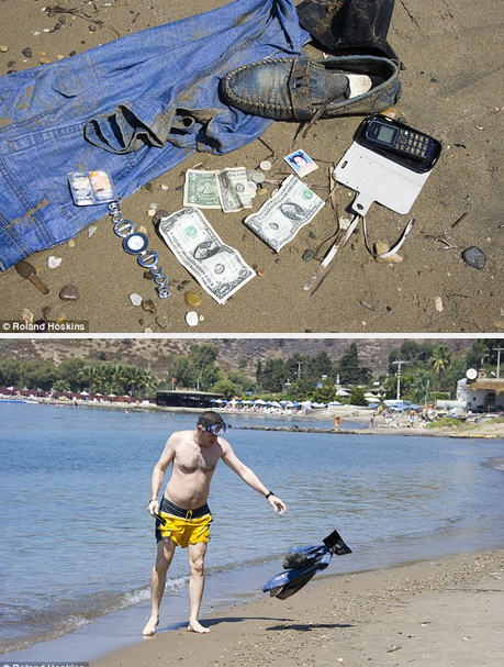 Khi đến bãi biển, Daily Mail cho biết, phóng viên của hãng tin đã mục sở thị cảnh du khách người Đức đang vớt những đồ vật còn lại của người tị nạn từ dưới biển, gồm 3 chiếc quần jeans, điện thoại di động, một chiếc đồng hồ thiết kế và đáng buồn nhất là bức ảnh của một cô bé trong chiếc ví, chưa rõ liệu có phải là em nhỏ thiệt mạng mới đây hay không.