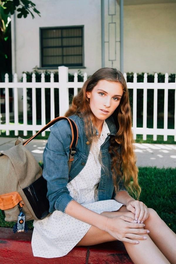 Bộ đôi áo sơmi chấm bi và chân váy xếp pleat tỏ ra hết sức ăn ý với ngoại hình nhỏ nhắn, dễ thương của cô bạn Dani 15 tuổi. Cô bạn khéo léo diện wedge sneaker để trông cao ráo hơn và chọn chiếc balô màu trắng xinh xắn ton-sur-ton với giày.
