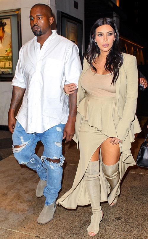 Rapper da màu bụi bặm, trẻ trung với sơ mi trắng và quần jean rách trong khi bà xã nổi bật với bộ cánh màu nude cầu kỳ. Đang mang thai nhưng Kim rất chăm chút cho vẻ ngoại hình. Cô còn được một số tờ báo Mỹ ngợi ca là "nữ hoàng bầu bí" bởi phong cách thời trang sành điệu. Người đẹp siêu vòng 3 giấu bụng bầu 6 tháng trong chiếc váy nhún bèo ở eo.