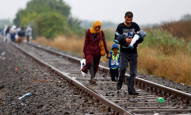 Một gia đình người nhập cư đi bộ trên đường ray tại Roszke, miền Nam Hungary. (Ảnh: AP)