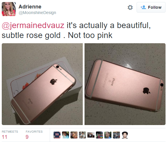 Người dùng @MoonshineDesign hào hứng khoe iPhone vàng hồng trên Twitter. Chính cô cũng bất ngờ khi nhận được máy sớm.