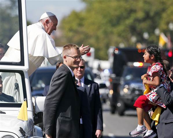 Trong khi xe chở Giáo hoàng Francis đang di chuyển chậm qua đám đông đứng hai bên đường để chào đón ông tại thủ đô Washington, một bé gái đã vượt qua hàng rào để cố gắng tiếp cận Giáo hoàng.