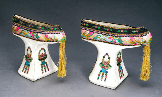 Khác với kiểu giày có dáng đổ dốc của phụ nữ hiện đại, giày đế cao thời Thanh có gót ở chính giữa.
