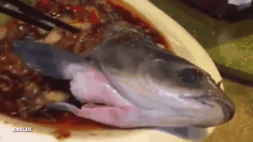 Được rưới nước ngập nước sốt nóng hổi và thơm lừng nhưng con cá dường như vẫn chưa chết hẳn. Mặc dù toàn bộ thịt ở phần thân đă được nấu chín nhưng đầu của nó vẫn có thể cử động.