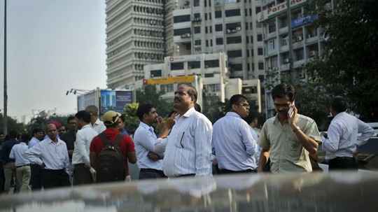 Nhân viên văn phòng ở New Delhi - Ấn Độ chạy ra ngoài đường khi động đất xảy ra. Ảnh: REUTERS